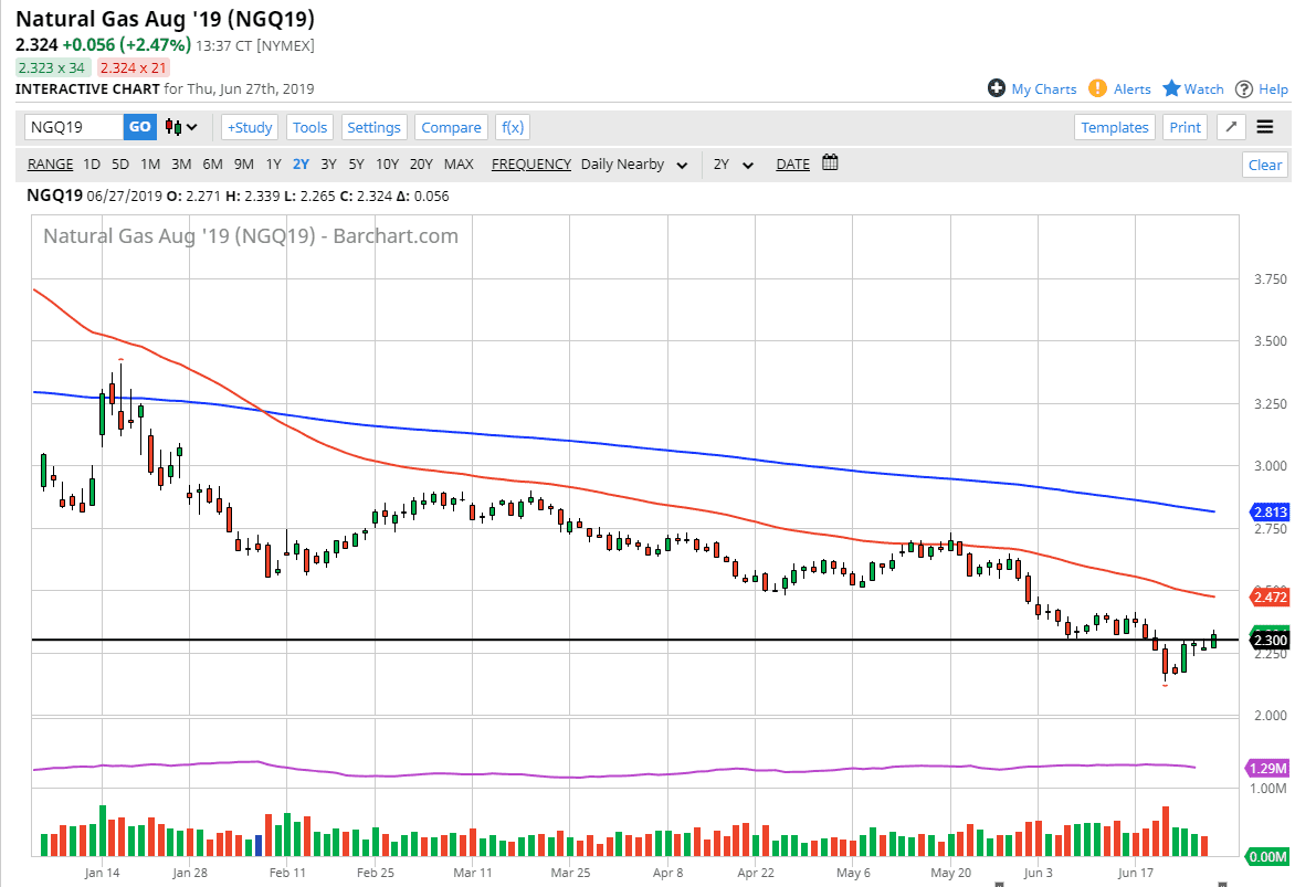 Natural gas markets rally during the day, breaking above the $2.30 level. There is a significant amount of noise just above here all the way to the $2.40 level though, so I think we are going to continue to see issues here. But frankly, this is a commodity that I think offers plenty of selling opportunities if you are patient enough. Right now we don’t have much in the way of technical indicators that tell us it’s time to start selling other than the fact that we are in the resistance area. The inventory number was “less bad” than anticipated during the day, so that of course has given us a little bit of a lift. I believe this is short-term at best, so at this point it’s just a matter of looking for signs of exhaustion on shorter-term charts that you can sell as we are months away from serious demand.