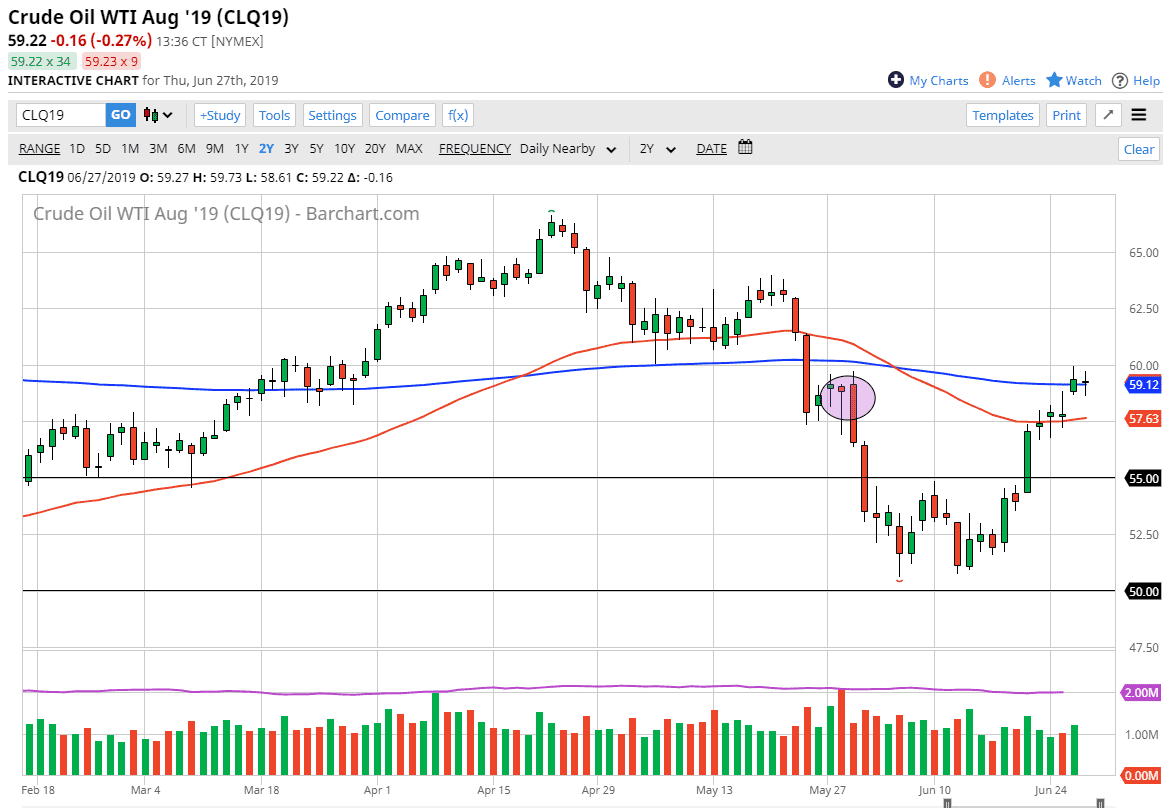 It’s difficult to imagine that the crude oil markets will do much during the day on Friday, because we are heading into the G 20 summit. Not that the G 20 summit means much anybody but the fact that the Americans and the Chinese are going to get together and speak will have a lot to do with what happens in the financial markets in general, this one won’t be any different. Beyond that, the $60 level above offers a massive resistance, so I think at this point it’s likely that we are going to see sellers in that area, just as we will have buyers underneath the candle stick for the day as there is a gap. This is a market that you probably should avoid until Monday morning unless we break the $60 level which would be extraordinarily bullish.