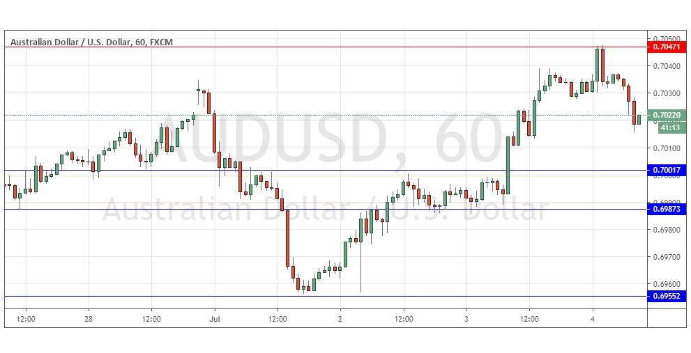 Go long following some bullish price action on the H1 time frame immediately upon the next touch of 0.7002 or 0.6987.