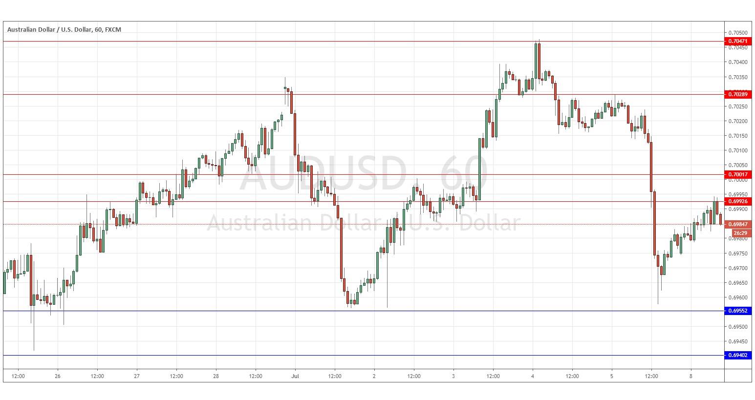 I wrote last Thursday that I thought the price was more likely to reach the major round number at 0.7000 before it hit 0.7047 again, and if there were a strong bullish bounce at 0.7000, it would probably be a good long trade. I was correct as the price quickly reached 0.7000 and cut through the round number like a hot knife through butter, which was a bearish sign, indicating a sharp fall down to almost 0.6955.