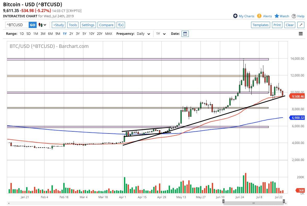 The candlestick is rather negative, but at this point it’s likely that the buyers will try to defend this uptrend line. Bitcoin has been very bullish because of money flying out of China, Venezuela, and many other places around the world. Beyond that, we also recognize that the Federal Reserve is likely to cut interest rates, and that should continue to be a driver of this pair higher, as it should bring down the value of the greenback in general. You will see this in the Forex markets, commodities markets, and of course Bitcoin. In fact, it appears that the Bitcoin market is place where people are looking to put their wealth into to preserve it in a low interest rate environment.