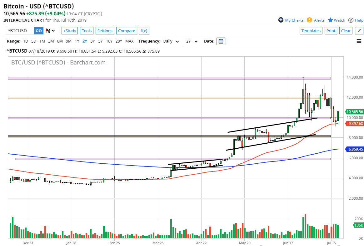 Bitcoin markets rallied as expected during trading on Thursday, after forming a very neutral and supportive looking candle stick on Wednesday. If you remember from the previous video I did on Bitcoin, I pointed out that the $10,000 level was psychologically important so it could offer a little bit of resistance. However, we also have the 50 day EMA offering support, which is something that tends to be rather important in the Bitcoin markets. By bouncing from this area and recapturing the $10,000 level, this is in fact very bullish sign.