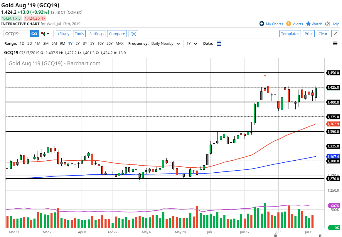 The Gold markets pulled back a bit during the trading session on Wednesday, testing the crucial $1400 level. This is a market that obviously has a lot of factors at work right now, not the least of which is going to be the central bank attitudes of easing, and that of course means that the precious metals market should continue to show signs of strength. Ultimately, a softening fiat currency world means that people start to look to the hard currencies to take advantage of which should be a nice and strong uptrend. One thing for sure, the candle stick for the trading session on Wednesday certainly shows strength and nothing else.