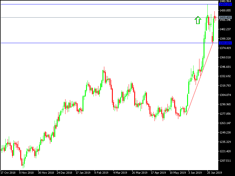 The performance of the yellow metal during the Tuesday session was a consolidation of the upward trend strength. This confirms the extent of investors buying gold in light of the increasing global geopolitical and trade tensions, and thus investors are escaping to gold to hedge against those concerns. This has pushed the price to 1428 dollars an ounce during yesterday's session, before settling around $1420 per ounce at the time of writing. The recent correction moves pushed gold to support $1383 after optimism over renewed US-China negotiations to end the biggest global trade dispute threatening global economic growth. The strong gold gains are due to the loss of trust among investors towards Trump. As he often negotiates and agrees and eventually impose more tariffs. This time the situation will be dire for the global economy and thus protect investors are hedging with safe heavens, most importantly, gold.
