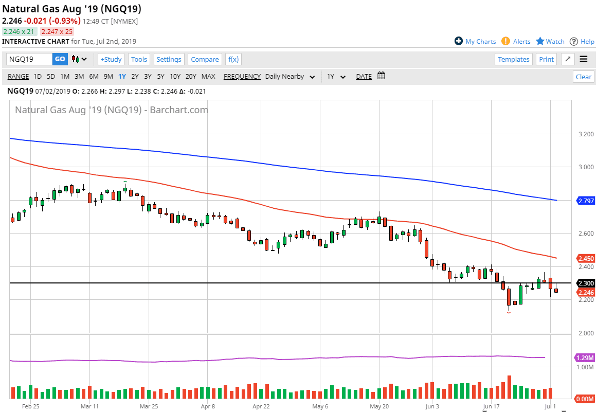 Natural gas markets tried to rally significantly during the trading session on Tuesday, but then pulled back to find selling pressure yet again. After all, the $2.30 level has been extraordinarily resistive, so therefore it’s likely that we will continue to see sellers in that region. At this point, it’s very likely that the market simply won’t be able to get out of its own way, as the massive amount of supply continues to be a major issue. Most natural gas is simply burned off as it isn’t worth harvesting.