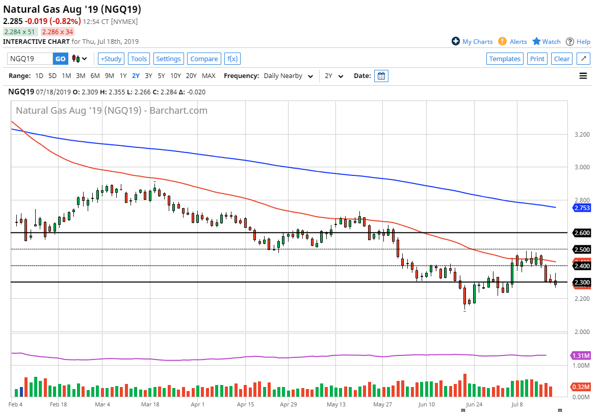 As we initially rallied during the day, a lot of value hunters came in to start shorting as the trend is most decidedly negative. By breaking below the $2.30 level, this is a market that looks bound to reach towards the $2.25 level, perhaps even the $2.26 level after that. While there were hopes of a market rebound due to the tropical storm slamming into the Gulf of Mexico, the reality is that the damage done was minor to say the least, and as a result it’s very likely that traders will be disappointed as the disruption of supply didn’t come to fruition. Beyond that, there was concern about heat picking up in the United States. That of course would drive up demand for natural gas to cool off homes. However, both of these situations would have been short-term to say the least, and therefore it’s likely that the longer-term outlook continues to come into play.