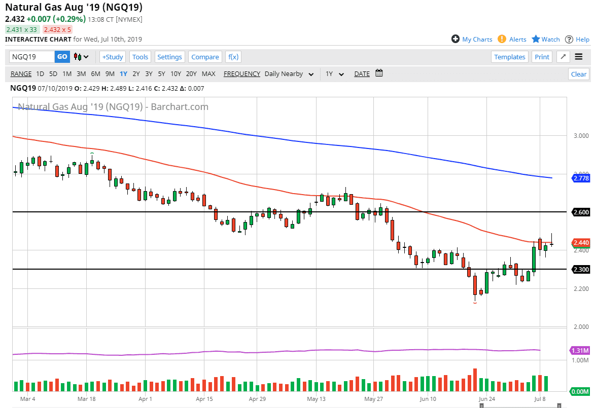 Natural gas markets ran into significant resistance later in the day on Wednesday, as the $2.50 level has caused selling pressure. Ultimately, this is a market that’s in a downtrend anyway so there’s no reason you should be buying it. The daily candle stick does look like it’s going to end up being a shooting star, which of course is a technically negative candle stick.