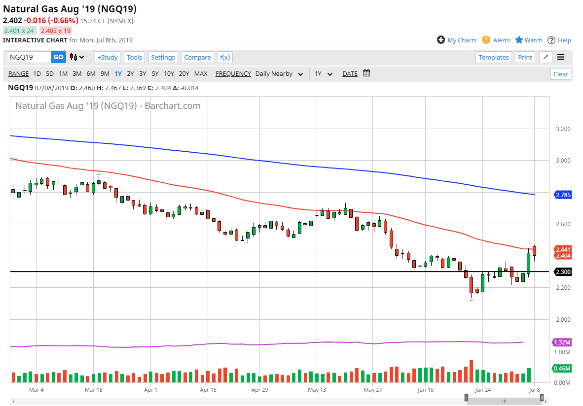 Natural gas markets gapped higher to kick off the week on Monday, and even managed to clear the 50 day EMA. That’s a very bullish sign but we have seen a turnaround since then, breaking well below the 50 day EMA and closing the gap, but did not bounce as one would expect. In fact, we broke down through that level and close near the $2.40 level.