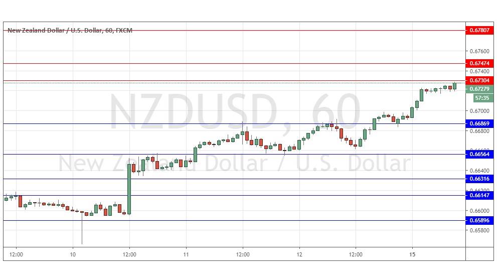 Short entry following bearish price action on the H1 time frame immediately upon the next touch of 0.6730, 0.6747, or 0.6781.