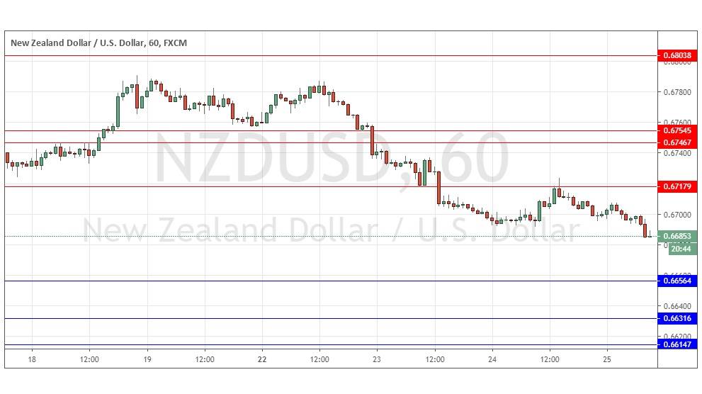 I wrote yesterday that the situation was looking even more bearish now, as the price seemed to be selling off again from the round number at 0.6700 and making new lows. The price had room to fall with no obvious clear support until 0.6656, so I was ready to take a bearish bias on this pair today if the first hour of the New York session saw the price close at a new short-term low price. It did not do so, but my generally bearish outlook was justified as the price has moved lower over the past day.