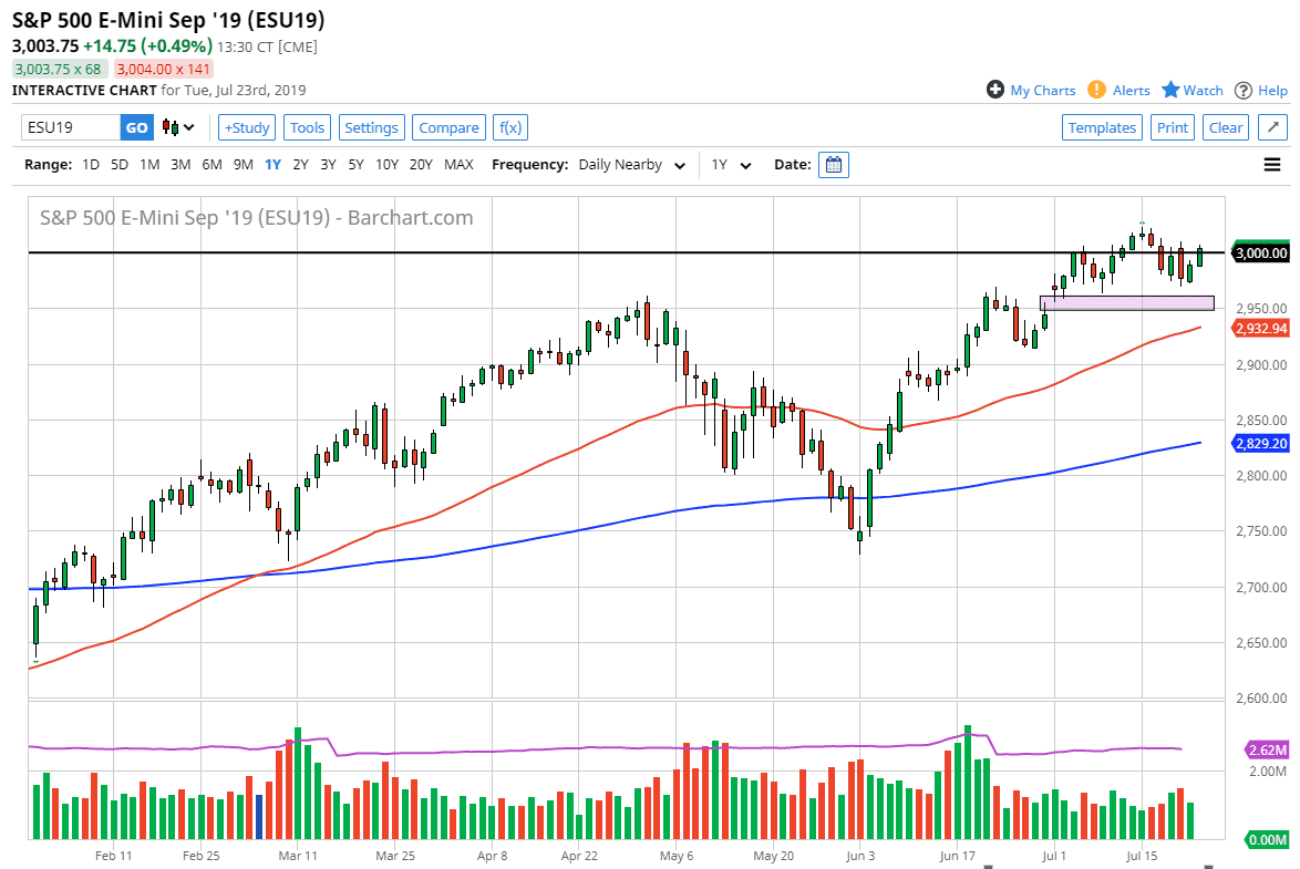 The S&P 500 rallied again during the trading session on Tuesday reaching towards the psychologically and structurally important 3000 handle. That’s an area that of course will attract a lot of attention as it is a century figure, but ultimately I think that what we are looking at is a scenario where we will eventually break out. Once we have that happen, this market can continue to go much higher, but I think there is a significant amount of resistance extending to at least the 3010 level. If we can break above there, then the market is very likely to continue to go much higher as it would be the last vestiges of resistance, at least in the short term.