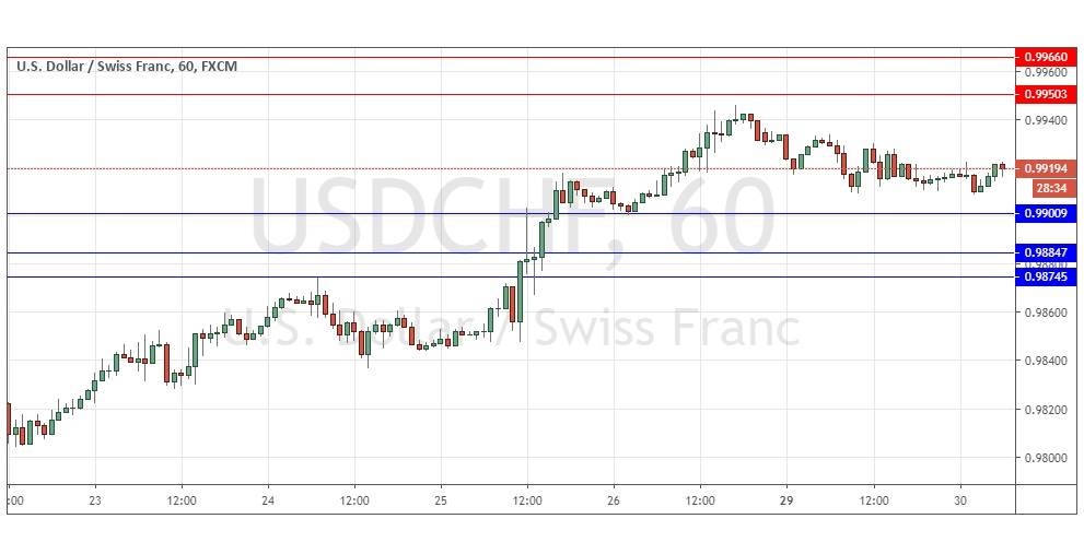 I have no strong confidence is the likely direction of the price, but I think that if 0.9900 holds as support, we will get at least a touch of 0.9950, which might then provide a good short-term trade entry opportunity – I would take a bearish bias at a convincing, firm bearish reversal at 0.9950.USDCHFThere is nothing of high importance due today concerning the CHF. Regarding the USD, there will be a release of CB Consumer Confidence data at 3pm London time.