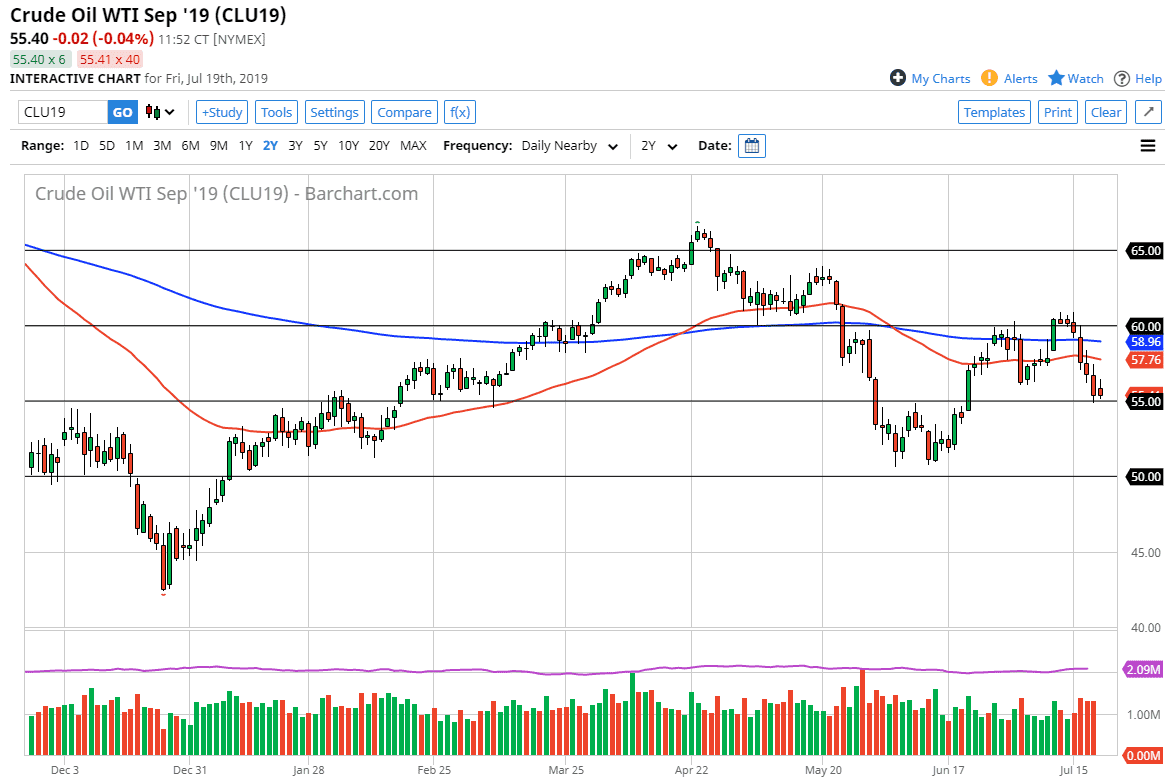 The WTI Crude Oil market initially tried to rally during the trading session on Friday, but then rolled over to show signs of exhaustion again, reaching down to the $55 level. That’s an area that was previous resistance, and it should now be supported. At this point, you should also recognize the fact that it is a large, round, psychologically significant figure, so that of course is something to pay attention to as well.
