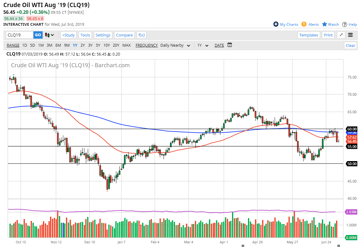 Even above the 50 day EMA, we have the breakdown candle that sits right underneath the 200 day EMA at $59. Ultimately, it looks like there is a lot of resistance above, as the $60 level with simply far too much. The market has taken a significant turn in attitude, and the fact that the drawdown in inventory continues to be strong, I believe at this point it’s very likely that the market continues to have a lot of negativity built into it. That being said, if we get a strong jobs number it might be enough to turn things around, at least temporarily. Another thing to keep in the back of your mind is that the United States and Iran tensions could continue to move this market back and forth. If things calm down, it’s very likely that oil falls, and of course vice versa.