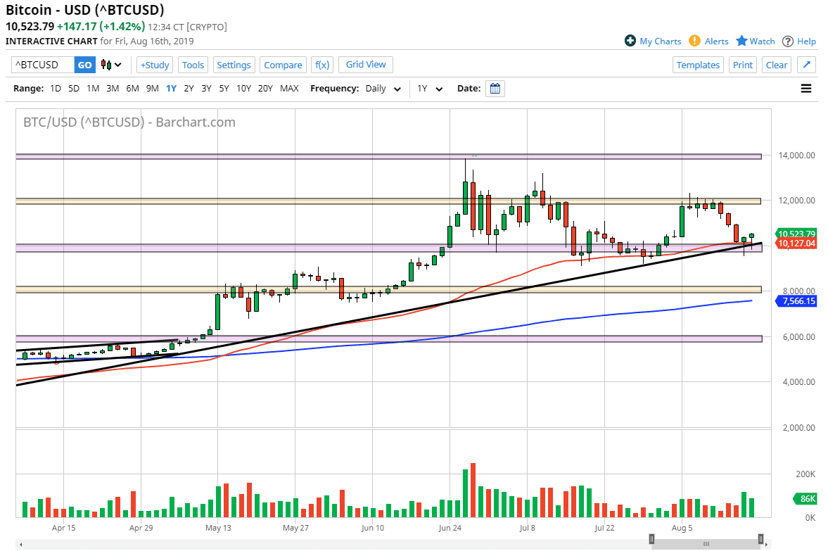 Not only do we have those hammers, but we also have the 50 day EMA slicing through the those hammers, so this is an extraordinarily strong sign. The $10,000 level is in that area as well, so there are at least four reasons to think that we are going to go higher. Again, we have the 50-day EMA, the trend line, the $10,000 level, and of course the hammers. All of this together is an excellent signal because to be realistic, a break down through would require a sudden change of attitude and a complete capitulation of buying pressure.