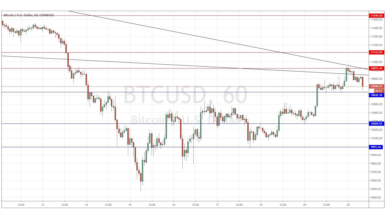 Yesterday’s signals were not triggered precisely, but I did forecast a bearish bias following a failure near $11,000 and this would have provided some profit on the short side. If such a trade was taken, it may be wise to close at least part of the position now as the price has reached close to the support level at $10,642.