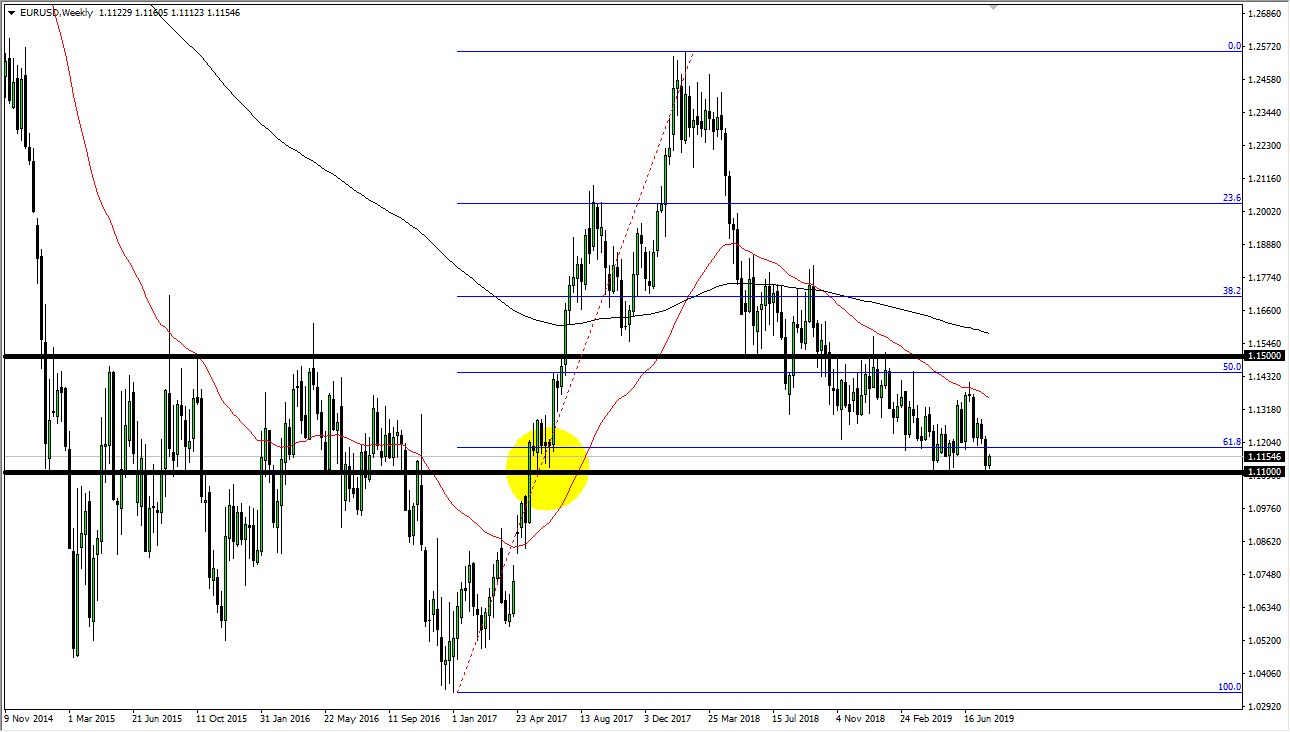 I do believe that the Federal Reserve is not only going to cut rates on July 31, but I also believe that they are going to be extraordinarily dovish in their statement. At this point, if they continue to show that extraordinarily dovish stance, then the market should rally from here, using the 1.11 level as massive support. However, we should always look at the opposite scenario as well, because as we know markets rarely do what we think they are going to do.