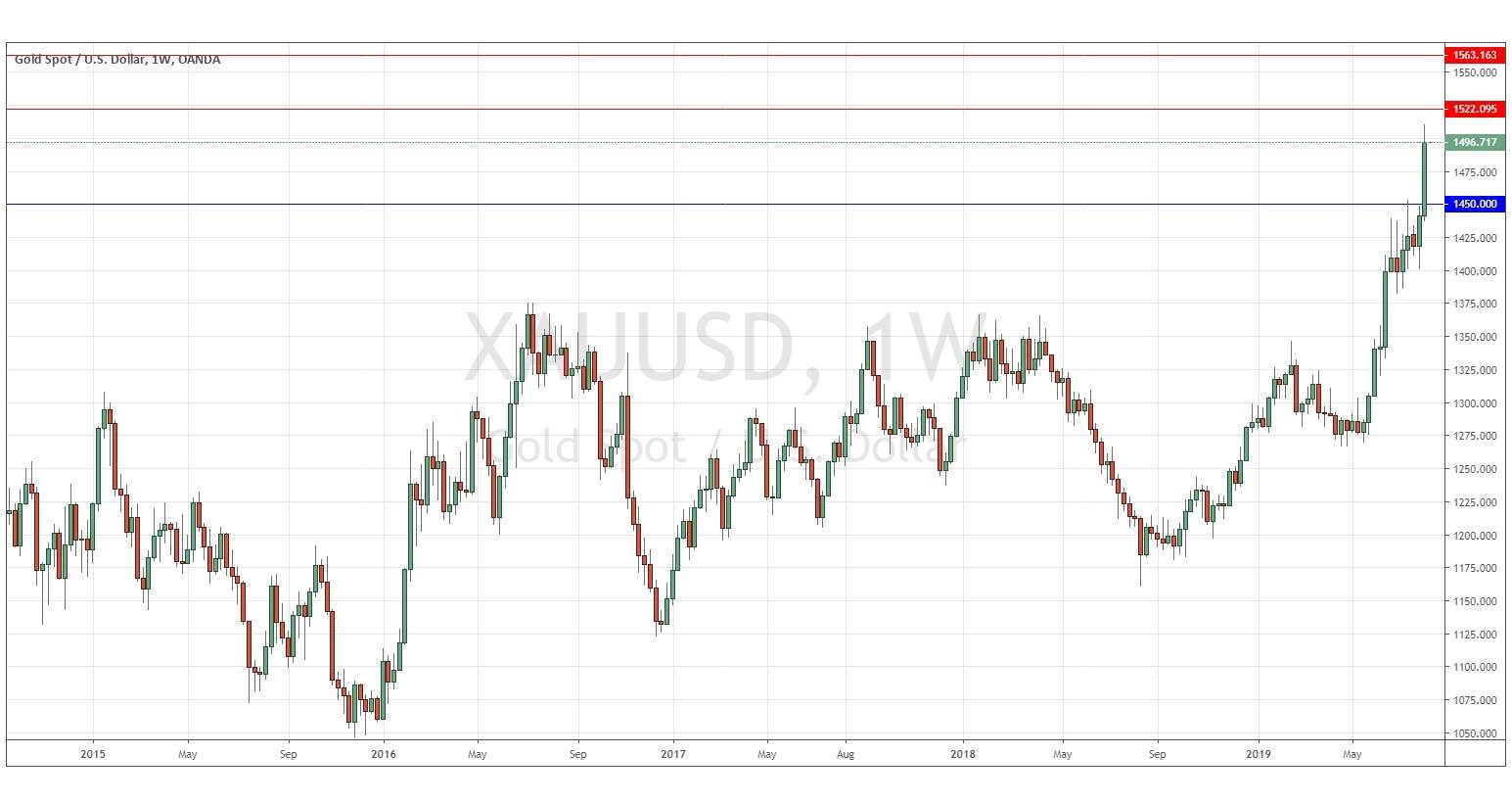 Gold in USD terms again made its highest weekly close in over 6 years, printing a very large and bullish candlestick which closed in the upper half of its range after breaking above the resistance level at $1450. Gold Is benefiting from the current flight to safety. These are all bullish signs, but there is an area which is likely to be key resistance at $1522 and beyond. I would take a long bias but only after a daily close above $1502 as this big psychological level has seemed to offer some resistance to the strong price rise.