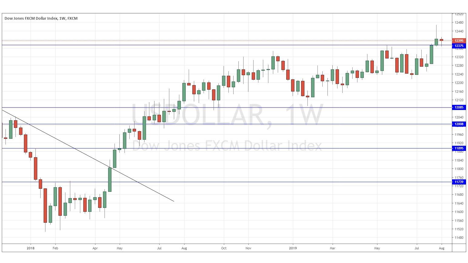 The weekly price chart below shows that last week the USD Index moved little, printing a small near-doji candlestick. The price is up over both 3 months and over 6 months, indicating a bullish trend. The week’s price action, while slightly negative, has based off new support at 12375, which is a bullish sign which suggests that we are a little more likely to see a further rise next week than a fall.