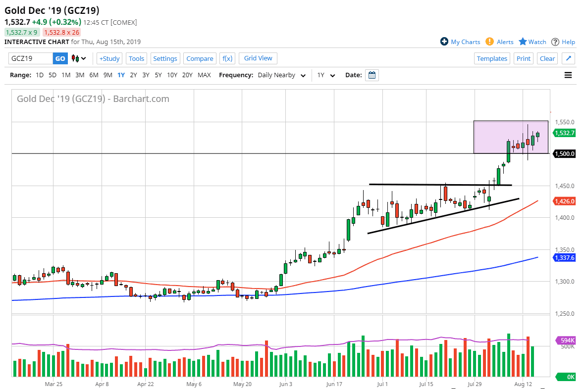 If we do break out to the upside, we could then reach above the $1550 level, and then start looking towards the $1600 level. I do think that happens given enough time because the central banks around the world continue to cut monetary policy back, meaning that the loosened monetary policy should continue to have the wealthy looking to protect their wealth in places like gold in Bitcoin. Silver, palladium, and platinum have all done well in this environment also, and I think should continue to do so.