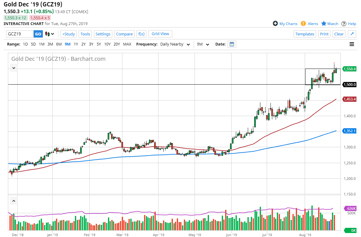 Gold markets are very likely to continue going higher given enough time, because although we ended up forming a massive shooting star during the Monday session, we have seen the market continue to try to grind to the upside. At this point, the $1550 level has continue to offer a bit of resistance, which is the basis of the shooting star from the Monday trading session. At this point, it’s likely that any short-term pullback will probably be a buying opportunity. The $1500 level underneath is a large, round, psychologically significant figure, and that of course is an area that will cause a lot of attention to be paid to this market.