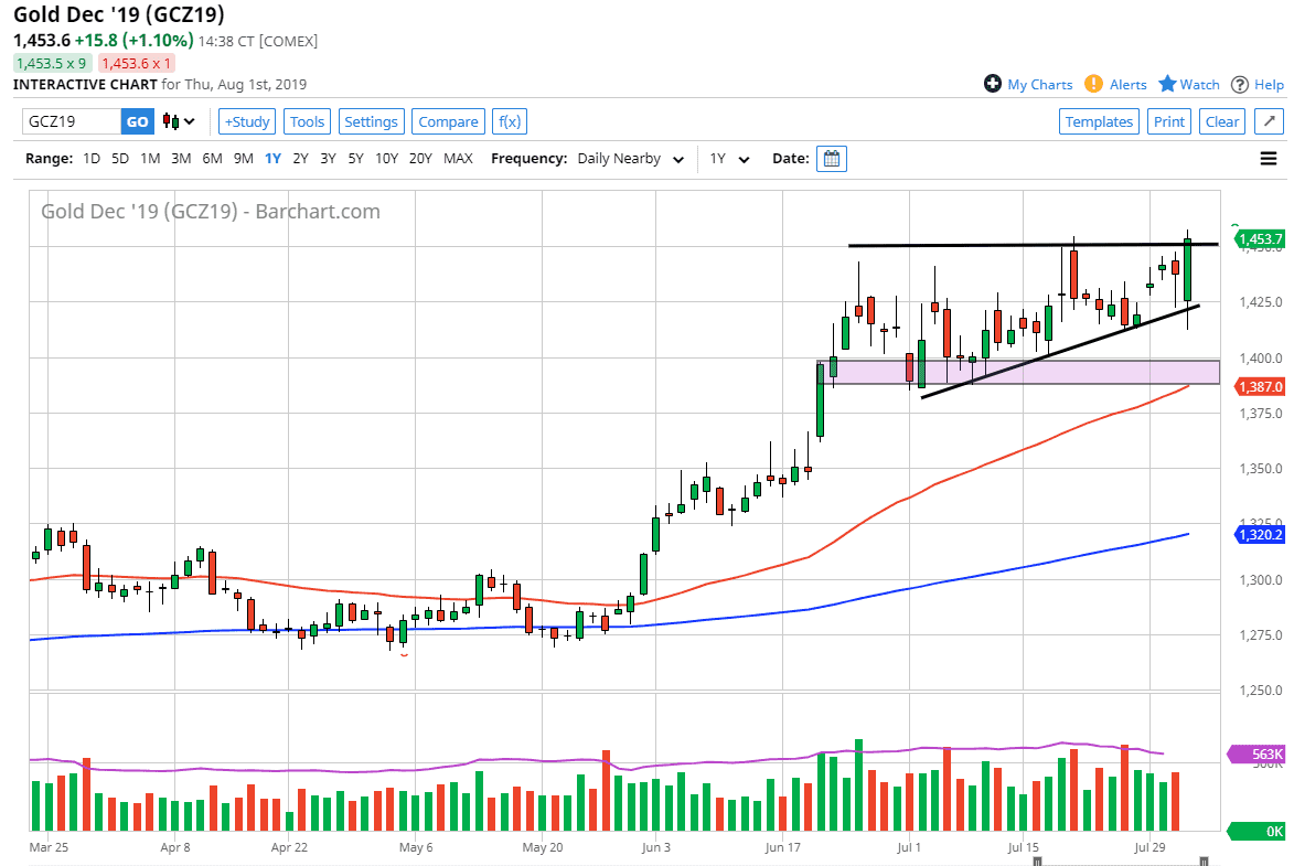 Gold markets exploded to the upside after initially pulling back on Thursday due to Donald Trump tweeting yet again. Now the latest thing is that he’s looking to add tariffs to the Chinese imports coming into the United States as of September 1. Another 10% as the market reeling, and there was a huge run towards safety.