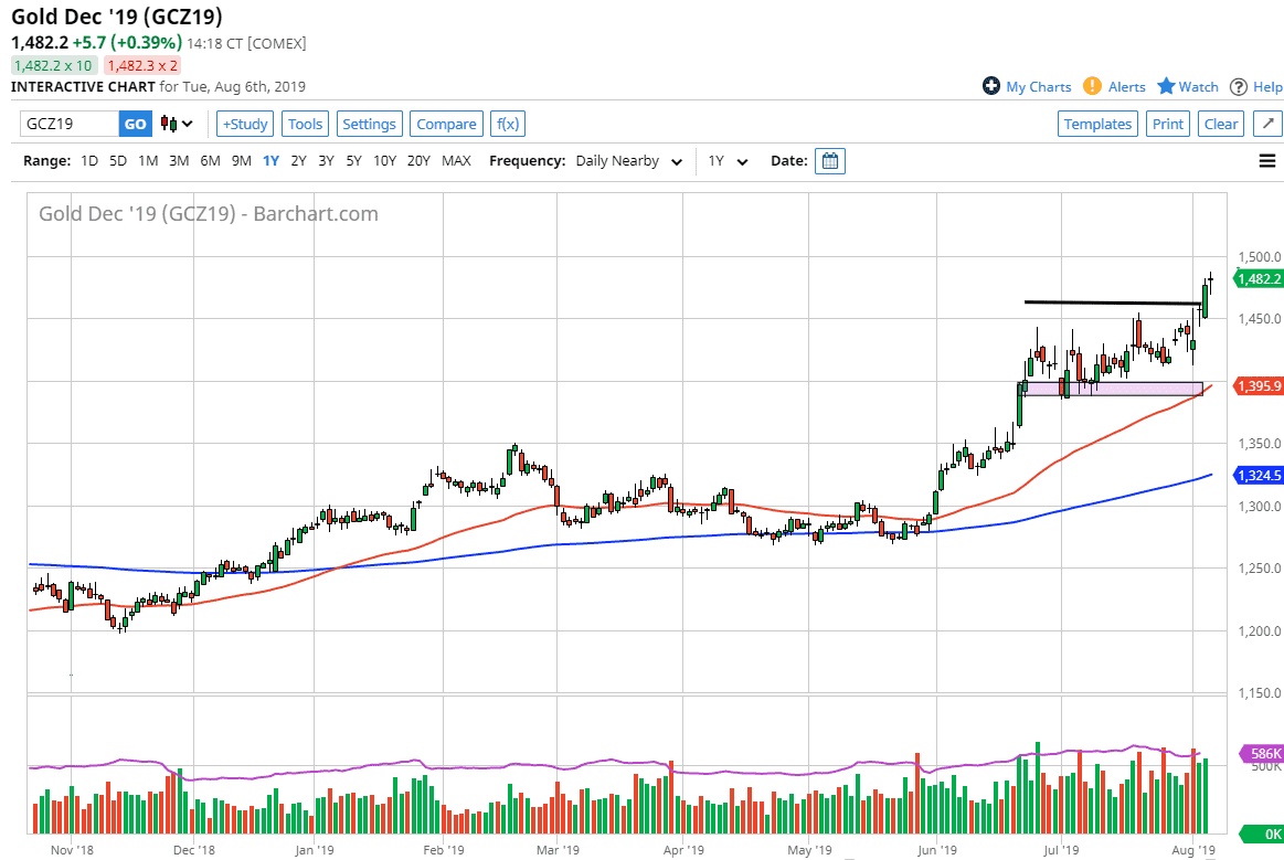 When you look at the chart, you can see that we had been consolidating but then broke out to the upside over the last couple of days. I believe that the $1450 level will offer support, just as the $1425 will be. The 50 day EMA is starting to slice through the $1400 level. In other words, I believe that is the absolute “floor” of the market. Overall, I recognize that we are looking at a slightly overbought condition, but the $1500 level above will probably cause quite a bit of resistance. I don’t know that $1500 will be massive structural resistance, but most certainly will be massive psychological resistance.