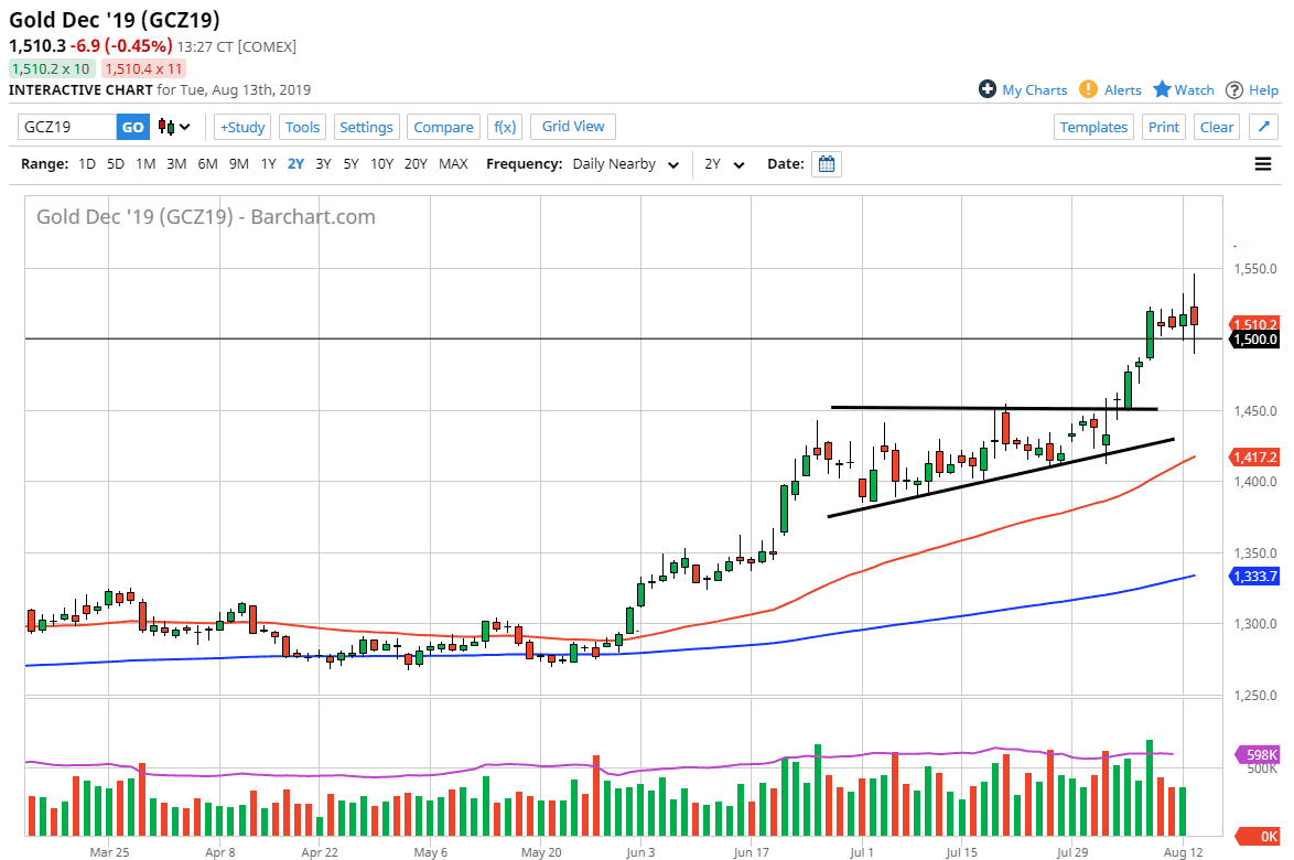 Gold markets went back and forth during the trading session on Tuesday as we continue to see a lot of volatility. The $1500 level of course has attracted a lot of attention, as we have used it as both resistance and support recently. That being said though, I think that the market is likely to pull back a bit from here, as the United States has offered to delay tariffs on Chinese goods.