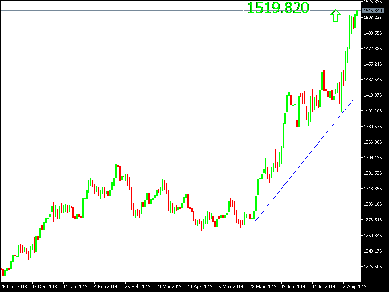 With the beginning of this week's trading, the price of gold fell to the $ 1488support level , from which it started again to test stronger resistance areas up to the top of $ 1520 an ounce at the time of writing. Gold gains hold on to its highest levels and still suggest it has enough momentum to test strongest peaks. With fears of a global economic slowdown, successive forecasts from international banks and financial institutions have shown that the US economy is on the way to recession in the coming months, which will support the Fed's cutting US interest rates. Morgan Stanley recently joined Goldman Sachs by expecting the Fed to cut interest rates in September and October.