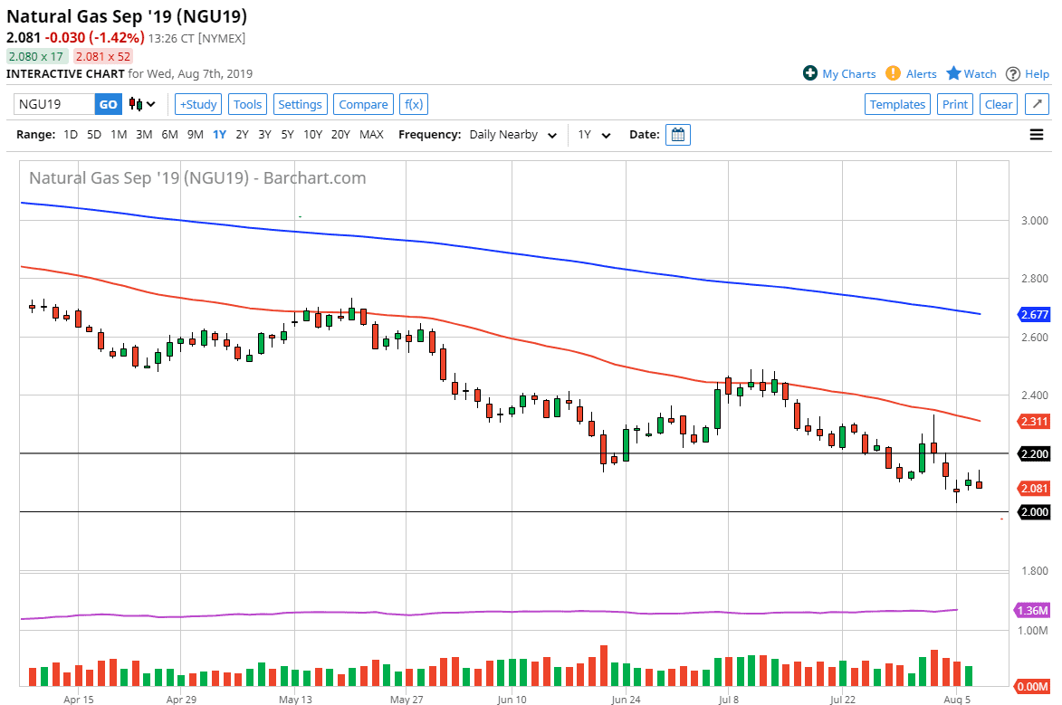 Natural gas is oversupplied. That’s really all you need to know. It’s also far too warm for natural gas to pick up a lot of bullish momentum, as we are trading the September futures contract. At this point, it’s not until we tray colder months that people will start to pick up the natural gas markets. That being said, it is also possible that the $2.00 level will offer a bit of a bounce due to the psychology involved. Ultimately though, if we were to break down below that level then the market will probably fall apart and go much lower. That would be a bit of a “trapdoor.”