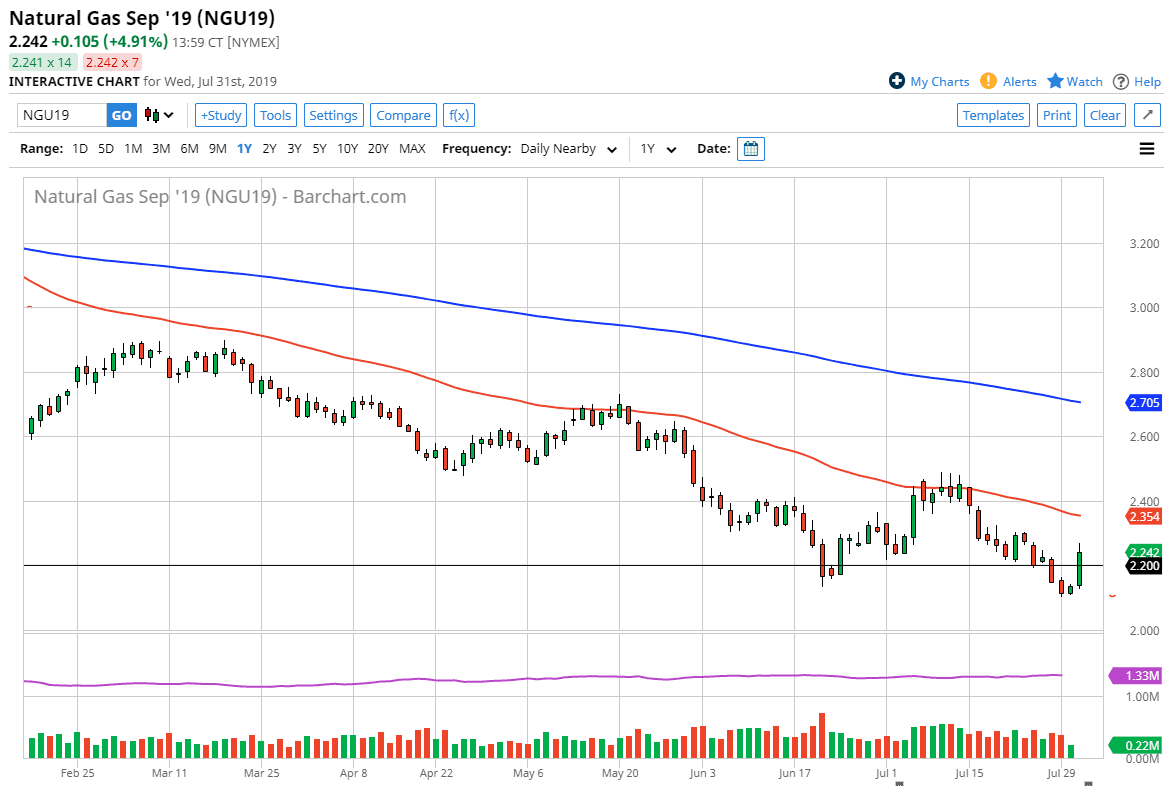 Natural gas markets rallied significantly during the trading session on Wednesday, breaking through the $2.20 level and reaching towards the $2.25 level after that. This of course is an area that could be somewhat resistive, and I do think that it is only a matter of time before we see a lot of sellers come back into the market. I believe at this point we are going to see the market form some type of long wick on a short-term chart that we can start selling into. With this, we have the 50 day EMA pictured in red above that should offer resistance as well, as we are in a massive downtrend.