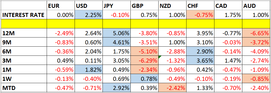 Let’s look at the relevant data of currency price changes and interest rates to date, which we compiled using a trade-weighted index of the major global currencies: