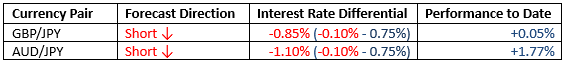For the month of August, we forecasted that the best trades would be short GBP/JPY and short AUD/JPY. The forecast’s performance to date is shown below: