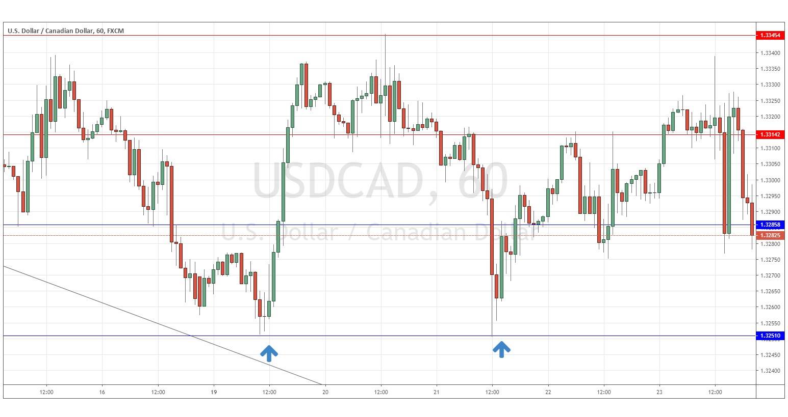 We had expected the level at 1.3251 might act as support, as it had acted previously as both support and resistance. Note how these “flipping” levels can work well. The H1 chart below shows how the price rejected this level towards the start of last Monday’s New York session (a great time to trade U.S. Dollar currency pairs such as USD/CAD) turning bullish right away with a bullish inside candlestick break marked by the up arrow on the left signaling the timing of the turn. This trade was profitable, achieving a maximum positive reward to risk ratio of approximately 4 to 1 so far based upon the size of the entry candlestick. The trade set up for a second time later in the week as a double bottom formed at 1.3251, with the entry at the right-hand upwards arrow marked on the price chart below.