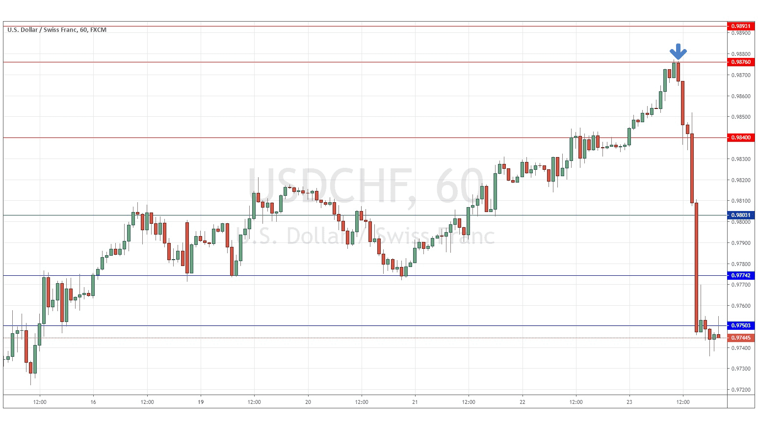 We had expected the level at 0.9876 might act as resistance, as it had acted previously as both support and resistance. Note how these “flipping” levels can work well. The H1 chart below shows how the price rejected this level towards the start of last Friday’s New York session (a great time to trade U.S. Dollar currency pairs such as USD/CHF) turning bearish right away with an engulfing candlestick marked by the down arrow signaling the timing of the turn. This trade was profitable, achieving a maximum positive reward to risk ratio of approximately 8 to 1 so far based upon the size of the entry candlestick, due to the fast, strong directional movement.
