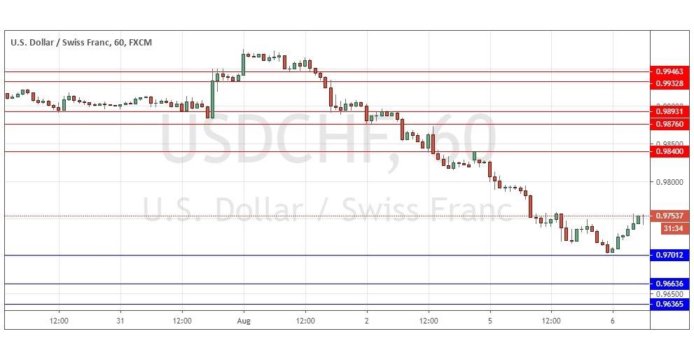 I wrote yesterday that the price had quite a long way to fall before reaching the nearest support level at 0.9725, and it looked as if lower prices were going to happen during the day’s London and possibly also New York sessions. This was a good call as the price did continue to fall and reach that level, getting even lower and making a low close to the round number at 0.9700 which is confluent with a support level.