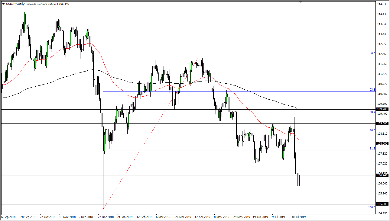 This is an area that of course is a large, round, psychologically significant figure, and therefore it makes quite a bit of sense that we had seen some proclivity to react to every 100 pips anyway. To the downside, the ¥105 level underneath is a support level, as it is a 100% Fibonacci retracement level from the original rally to the upside. We are well below the 61.8% Fibonacci retracement level so it makes sense that we go looking for that level. At this point I believe that we will have sellers come in every time we try to rally, at least until we get some type of stability in this market. This is a market that is going to continue to be negative, as there are so many geopolitical situations and of course negativity when it comes to global growth and trade tensions. I think it makes sense that the Japanese yen continues to get a lift, and even though the Bank of Japan said during the early Asian hours that they were monitoring the Forex markets, we know from previous actions that the Bank of Japan can come in and move the markets, but it is only temporarily.