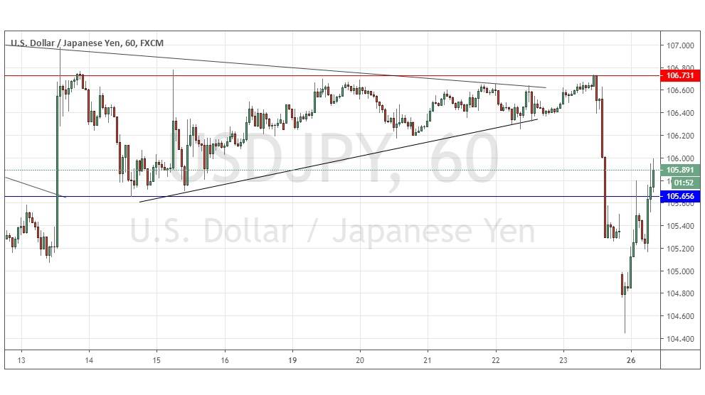 - Go long following a bullish price action reversal on the H1 time frame immediately upon the next touch of 105.66.