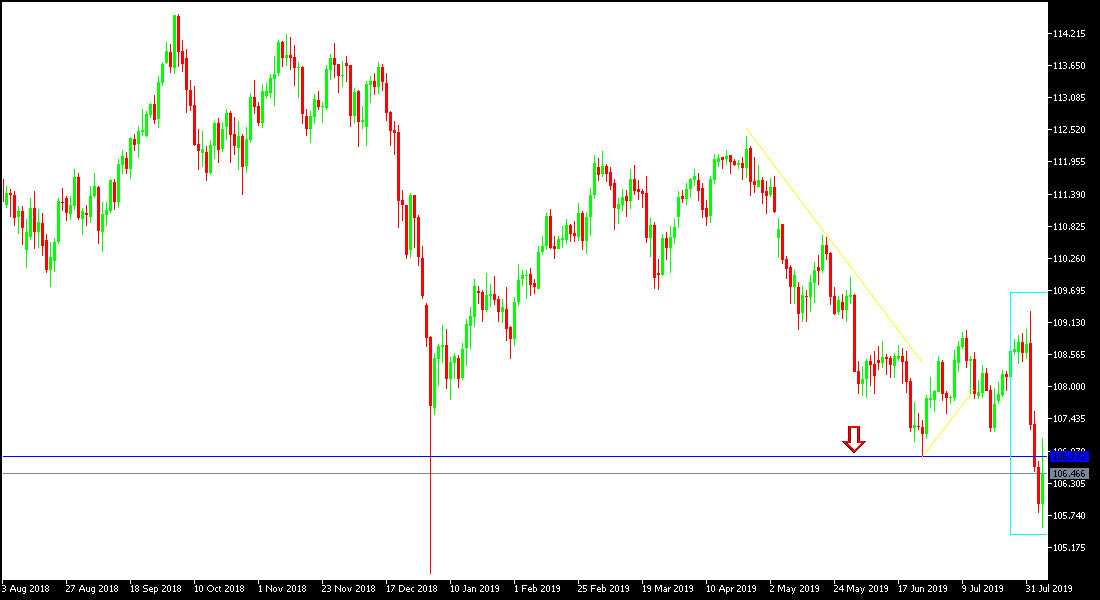 The recent violent bearish correction pushed the USD / JPY pair to move towards the 105.51 support level in early trading on Tuesday, its lowest level in seven months, before trying to bounce back to 107.08 and settling back around 106.48 support at the time of writing. The pair is trying hard to stop the pace of decline and investors want to return to buy the pair after reaching those attractive levels. The recent record gains of the Japanese yen supported by investors' flight to safe havens, and risk aversion, as the situation in the trade war between the world's two largest economies worsened with the United States imposing more tariffs on China's imports and the latter retaliated by announcing the devaluation of the Yuan below the $7 level for the first time in 10 years, reducing the appetite for US exports in world markets and strongly support Chinese exports, which have been severely affected by the trade dispute with the United States.