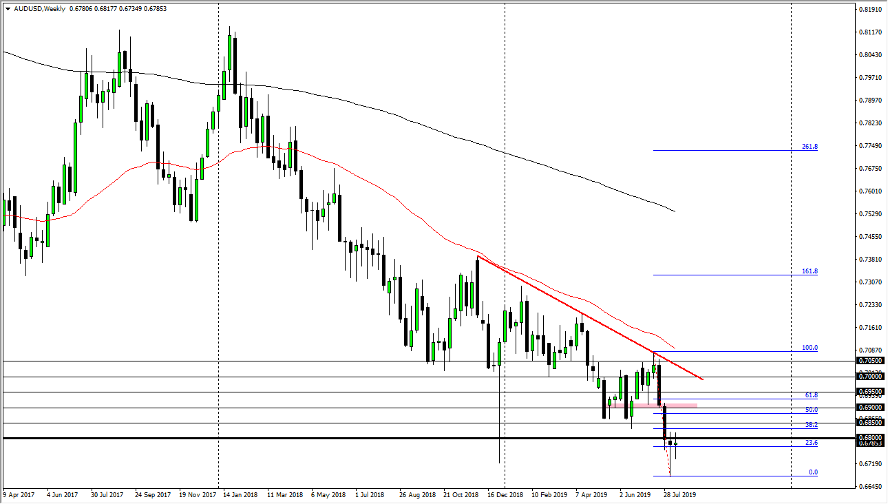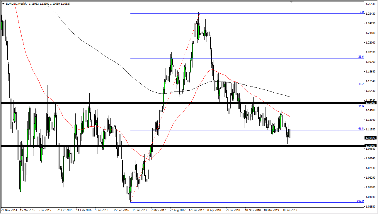 The Euro initially tried to rally during the week but then broke down rather significantly. As economic numbers continue to deteriorate in the European Union, I believe that this pair will continue to drift towards the 1.10 level underneath. At this point, the market is probably one you should be looking for short-term rallies, as although there is noise in this pair, it’s obvious that the downtrend continues. Eventually I believe that this market will probably break down through the 1.10 level and go looking towards the 100% Fibonacci retracement level, but that’s a longer-term call obviously. In the short term I’m looking for exhaustion to take advantage of.
