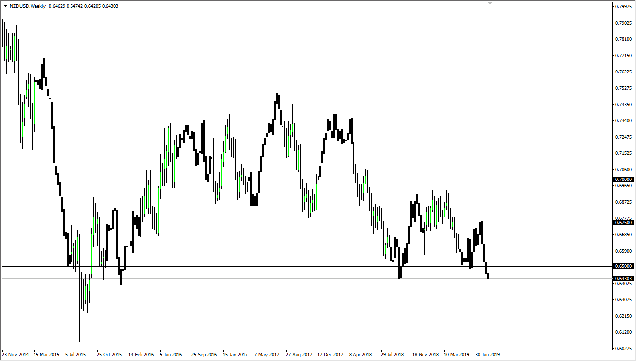The New Zealand dollar has fallen a bit during the week, as we stay well below the 0.65 handle. At this point, I think we are going to test the 0.64 level and then eventually break down through there. It makes quite a bit of sense as there is a lot of “risk off” attitude out there, which works against the value of commodity currencies such as the New Zealand dollar. I believe in selling short-term rallies as long as we stay below the 0.65 handle which I look at as a ceiling.