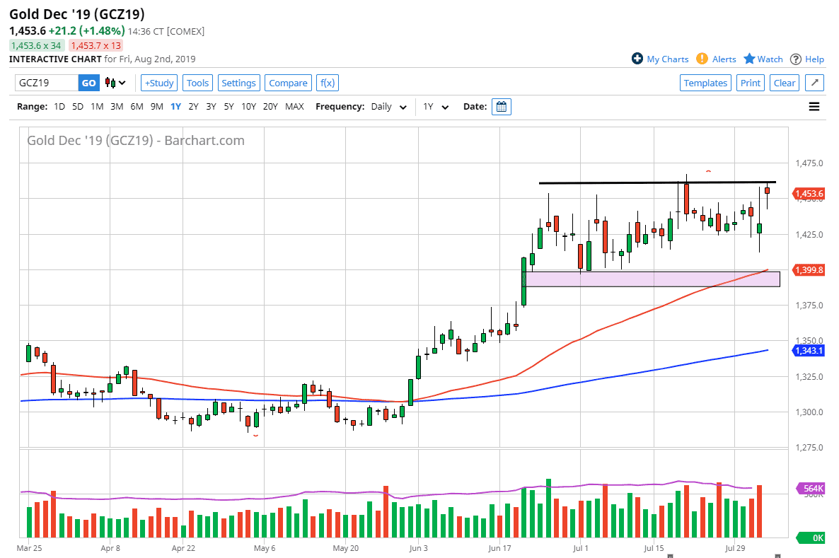 Ultimately, this is a market that has been bullish for some time and it now looks as if it is really start to try to take off to the upside. Gold markets of course are reacting to a lot of fear around the world when it comes to Donald Trump and the Chinese, as well as global trade slowing down. With all of that being said, the fact that the central banks around the world are cutting interest rates also supports hard money such as gold and silver.