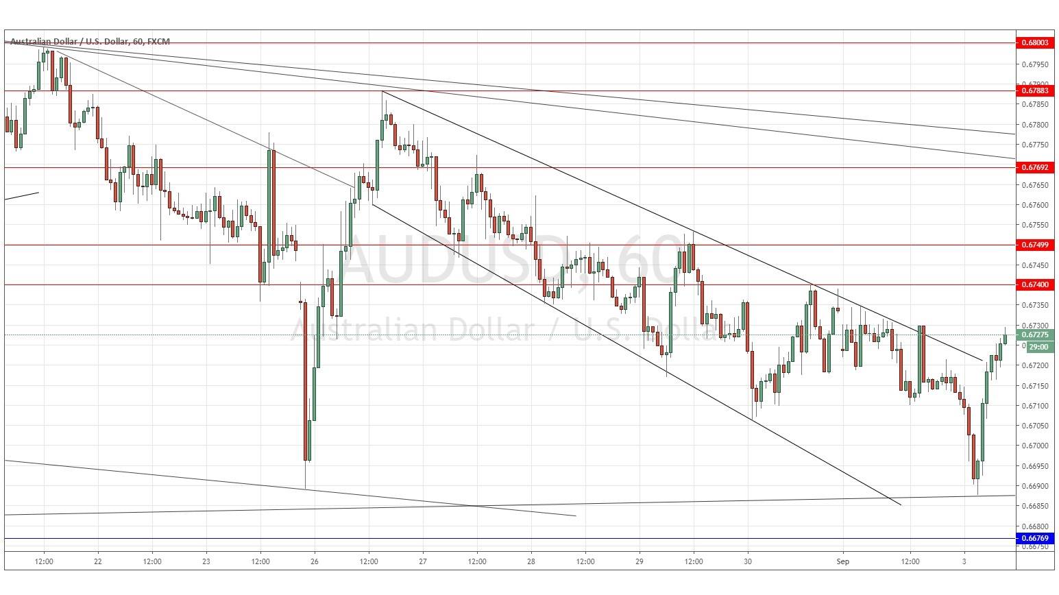 This was a good call as the price did descend until the big release from the Australian central bank (the RBA), which left the cash rate unchanged at 1.00% and boosted the Australian Dollar considerably with a rise which is still ongoing to new highs on the shorter-term charts. We have seen a break over the past few hours above the upper trend line of the bearish channel which is a bullish sign. We also have a long to medium-term triple bottom at the 0.6690 area, which suggests that the price may find it difficult to get meaningfully lower than this. However, on the other hand, there is a lot of resistance within the 75 pips above the current price, and it is hard to see much of this area being broken to the upside.