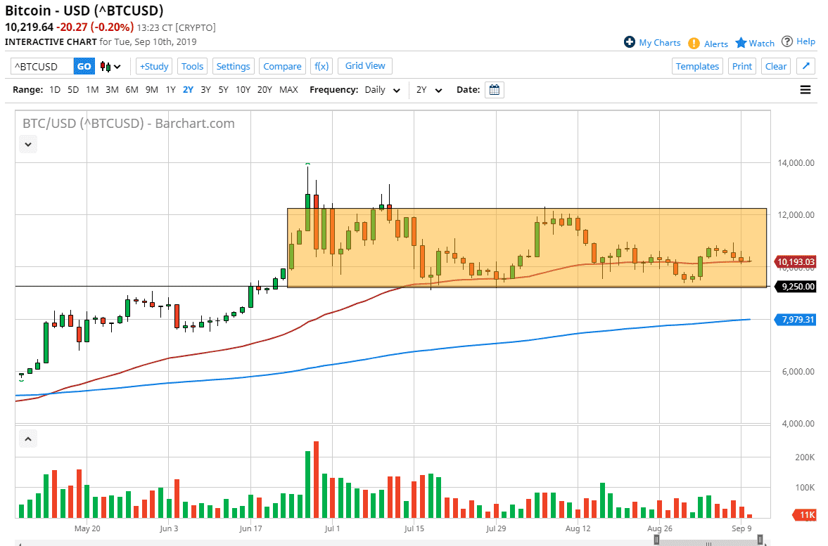 Even if we do break down below the $9250 level, I’m fairly certain that the 200 day EMA which is closer to the $8000 level should offer a bit of support as well. If we did break down below there, then you have to question the entire trend. All things being equal though, this is a market that is very sideways, but I think at this point it’s likely that we will continue to see interest in Bitcoin as it is not only a way to get away from fiat currency, but it is also a way to get away from Central Bank monetary policy. After all, that’s one of the biggest appeals of crypto, and of course Bitcoin is the biggest market. Central banks around the world are still on cue to start cutting monetary policy back to more of an easy stance. This week it’ll be the ECB, but in a couple of weeks it’ll be the Federal Reserve. Ultimately, Bitcoin is rallying for the exact same reason precious metals have been rallying, it’s a way to get away from Central Bank disruptions and distortions in the market. If we can break above the last couple of days, that would be an extraordinarily strong sign as it would be slicing through the top of a couple of shooting stars.