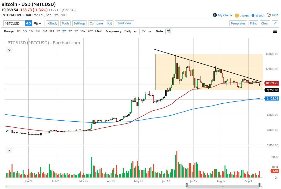However, if the market breaks above the downtrend line, then it gives the market a chance to get to the $12,000 level, and then possibly even the $14,000 level at the top of the triangle. Either way, Bitcoin will need to make a decision rather soon, and I will be the first person to admit the fact that the interest rate cut and the potential continued quantitative easing out of the Federal Reserve not dragging down the value of the dollar and therefore bringing up the value of Bitcoin is a rather negative sign.