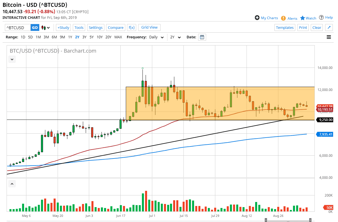 The Bitcoin market continues to be very choppy and sideways, but at this point we initially tried to rally during the day on Friday but has given back some of the gains later in the day. We are currently dancing around the 50 day EMA, which is currently trading at the $10,192 level. At this point, it’s likely that we will continue to find plenty of buyers underneath, especially at the uptrend line that is marked on the chart and then of course the $9250 level.