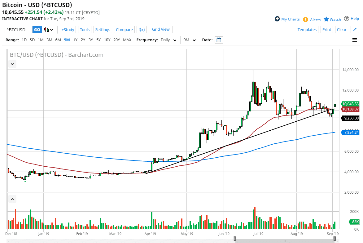 Beyond that, the 50 day EMA is now below current pricing, so it makes quite a bit of sense that some longer-term traders will be attracted to this market. When I look at this chart, now that we have recovered that trend line it’s obvious that the $9250 level offered significant support as it had in the past. At this point, when you look at the market it’s very likely that we are entering a significant consolidation phase, or at least extending the one that we had been in. If that’s going to be the case, then it’s likely that we are going to go towards the $12,000 level above which should be massive resistance. Having said that, it is also very likely to be a target of interest as it has been tested several times in the past.
