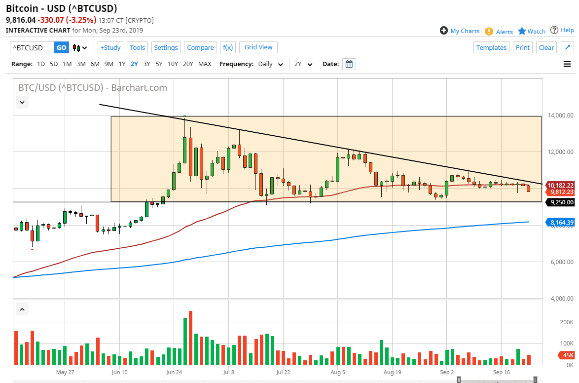 The Bitcoin market broke down significantly during the trading session on Monday, making yet another attempt to reach below the $9800 level. If you been following my articles here at Daily Forex, you know that I have recently started to pay close attention to the descending triangle that I have marked on the chart. Beyond that, something else that concerns me is that even with all of this central bank quantitative easing and interest rate cuts out there, bitcoin has seem to have stalled a period if the Federal Reserve is entering a dovish theme, then it’s very likely that bitcoin should be rising. However, it’s not and that could be the biggest thing to pay attention to.