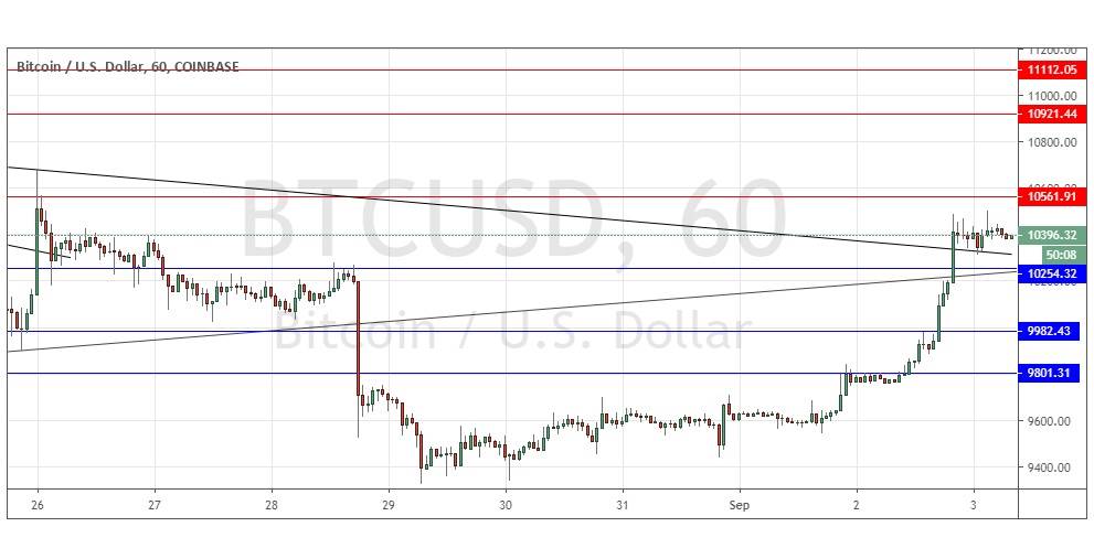 Go long at a bullish price action reversal on the H1 time frame following the next touch of $10,254, $9,982, or $9,801.
