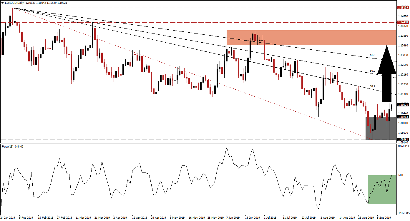 The ECB delivered a 10 basis point interest rate cut in its deposit facility rate to -0.50% and announced the restart of its QE program starting November 1st 2019 at a pace of €20 billion per month, open ended. It has also reduced borrowing costs on long-term loans by 10 basis points in order to assist the Eurozone banking sector. While the Euro initially sold off after the announcement, it made a quick reversal. This resulted in a breakout in the EUR/USD above its support zone, marked by the grey rectangle, which is located between 1.09261 and 1.10263. The 38.2 Fibonacci Retracement Fan Resistance Level will now dictate terms of price action moving forward.